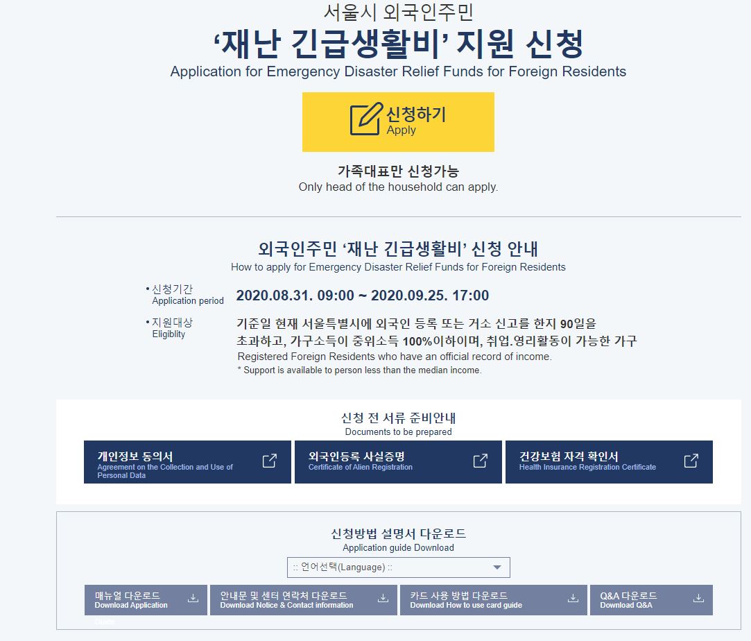 その後、8月の末日になってやっと外国人世帯への災難支援金の支給に関する具体的な案内が出ました。韓国人配偶者がいる外国人の場合は、すでに4~5月に支給された災難支援金を受け取れているので、今回は対象に入っていません。つまり、今回の災難支援金は純粋に外国人だけの世帯の場合で、入国後90日以上が経過していて外国人登録を済ませている人が対象となりました。