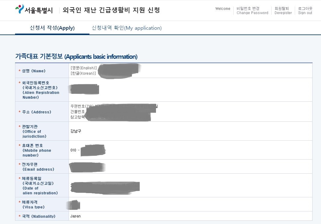 さて、やっとソウル市のホームページから災難支援金の申請ページに入って