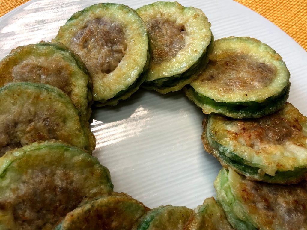 エビは下調理し、ズッキーニは真ん中をくり抜いて、お肉のミンチはよく混ぜて寝かせておきます。